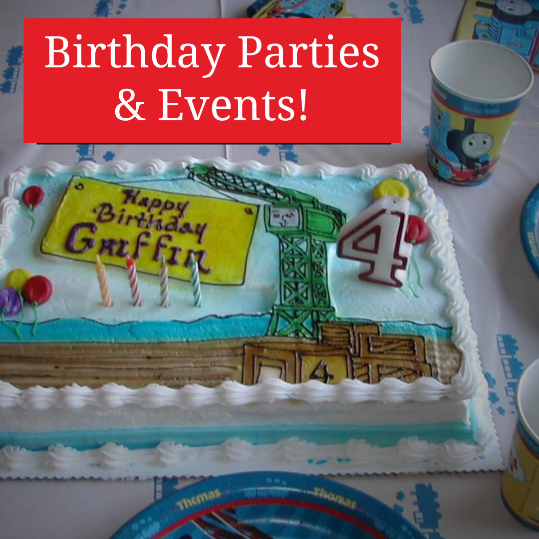 The 23’ x 25’ space includes FULL access to our train displays. With a large TV with BlueRay player, you also get access to our children’s play area featuring wooden toy trains, basketball arcade, beanbag toss, an more. Birthday Parties can also gain access to hand-on control of Thomas the Train.
